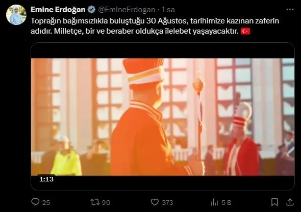 Emine Erdoğan, sosyal medya hesabından yaptığı paylaşımda, 30 Ağustos Zafer Bayramı Özel Konseri’nde Cumhurbaşkanı Recep Tayyip Erdoğan’ın hitabından ve programın detaylarından hazırlanan videoya yer vererek, “Toprağın bağımsızlıkla buluştuğu 30 Ağustos, tarihimize kazınan zaferin adıdır. Milletçe, bir ve beraber oldukça ilelebet yaşayacaktır.” ifadelerini kullandı.